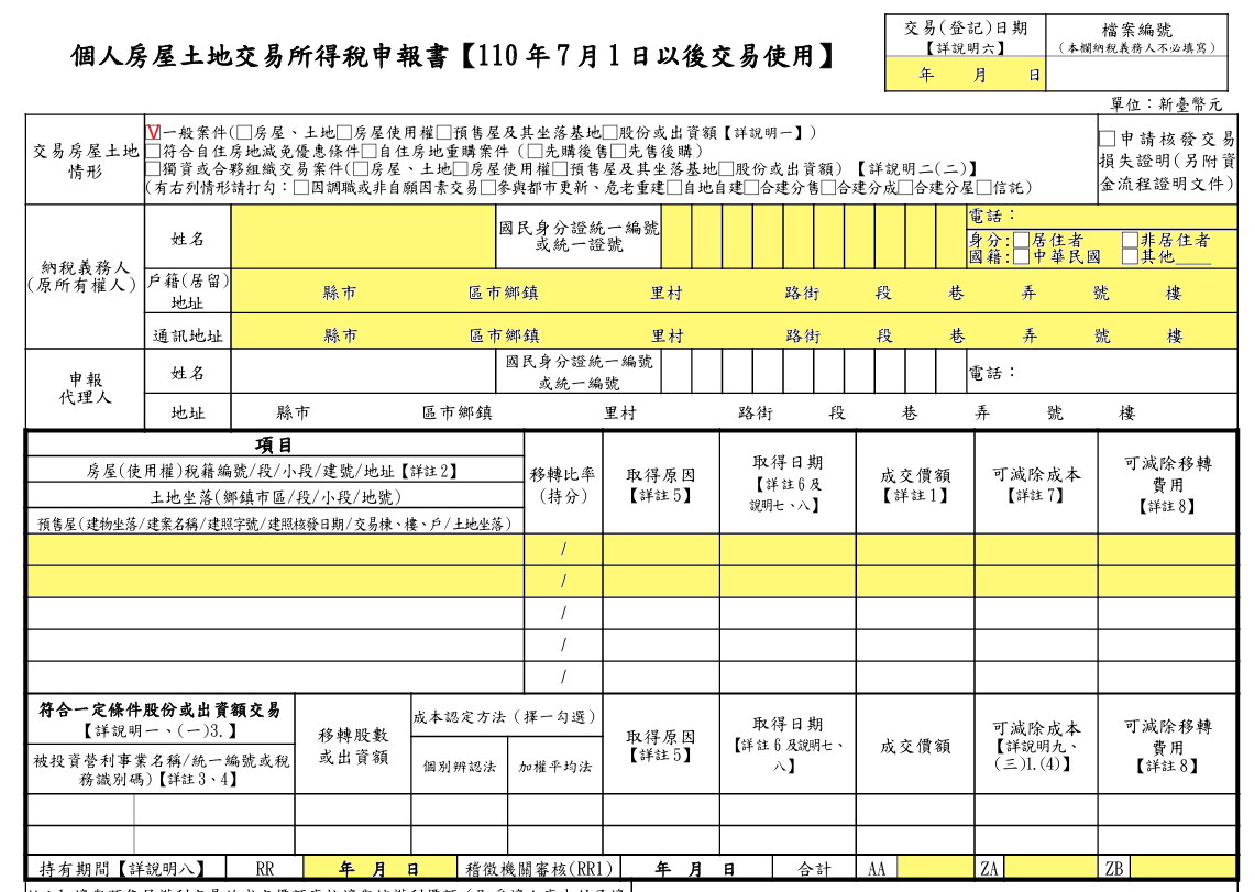 於房地合一稅新制下,個人應於房屋、土地完成所有權移轉登記日(房屋使用權、預售屋及股份或出資額為交易日)的次日起算30日內自行依規定格式填寫申報書,自行向戶籍地國稅局或線上納稅申報。無論您是否有應納稅額或甚至有損失,都必須申報,逾期申報將產生滯納金與罰鍰。Work Steps