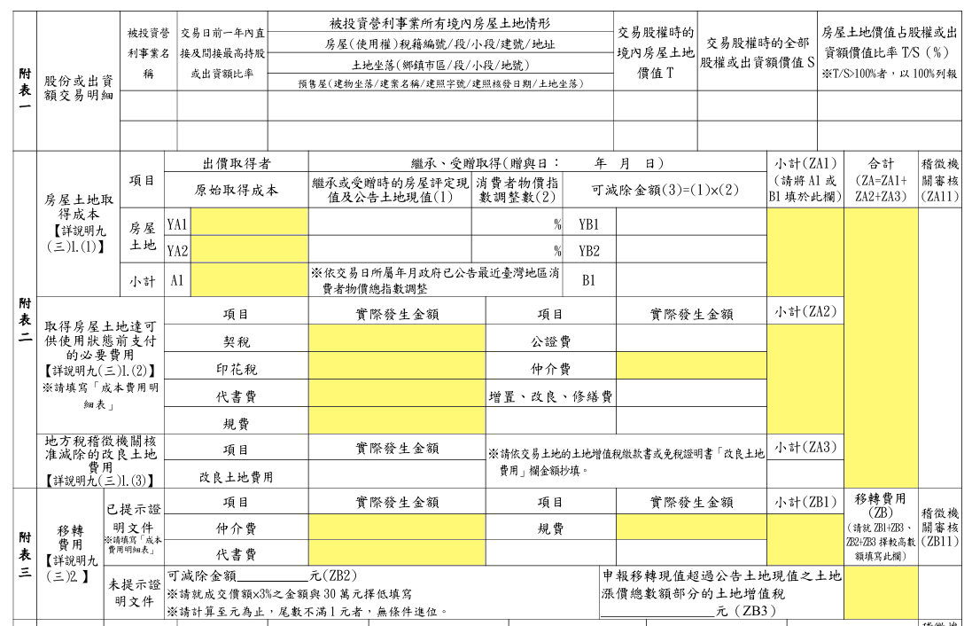 可減除成本、可減除移轉費用由第二頁(表二)、(表三)計算後填入