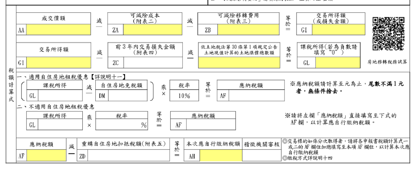 回到第一面下方將金額、可減除成本、可減除移轉費用、土地漲價總數額填入,依取得期間稅率計算。